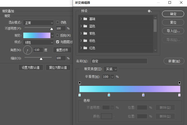 1、添加渐变,我用的是蓝色到紫色的渐变: