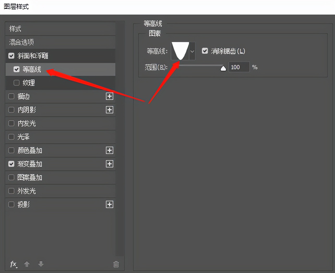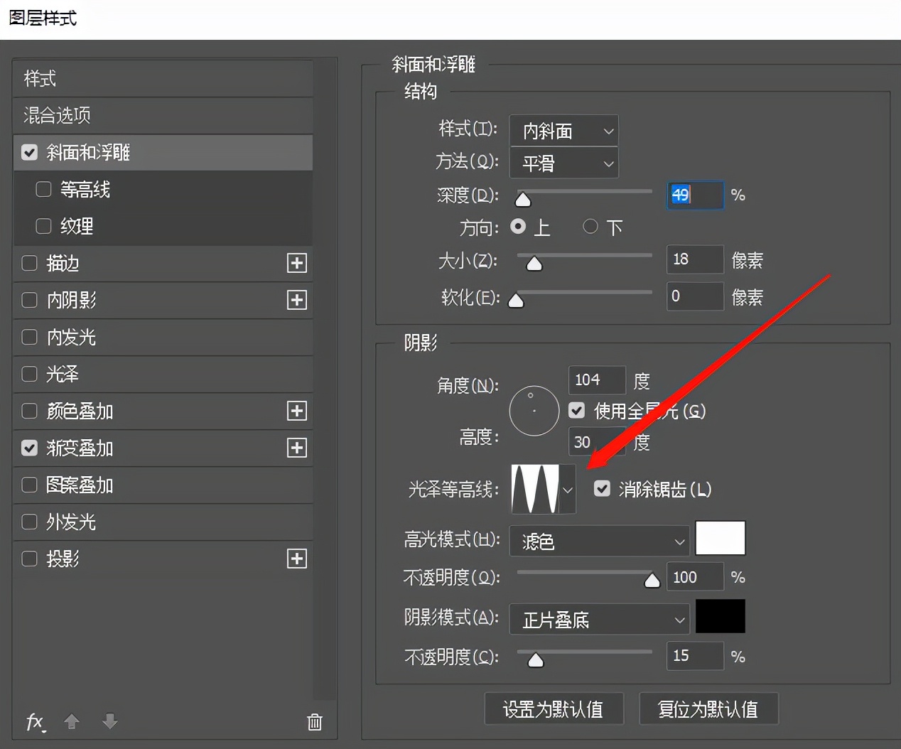 2、接着添加浮雕效果,参数大家可以自己看着调,注意光泽等高线那里,选一个相对复杂一点的等高线,这样可以让你的边框有更复杂的立体效果。