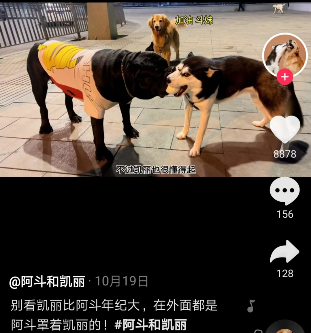 小子也是在那一次斗爸的救援中认识了斗爸,从那以后,(单身)斗爸和阿斗凯丽生活得很愉快,并且在某音上持续性的更新它们的生活片段,阿斗因为天性使然吧,更大大咧咧,常常会带着阿斗和别的狗狗挣玩具,阿斗累了就会“放嘴”让凯丽接上,但是性格温顺的凯丽怎么敢呢,阿斗在一旁看着那大狗的眼神,又看看怂的不行的凯丽,阿斗径直走开了,引得拍视频的斗爸一阵大笑,当然笑得人可不止他一个。